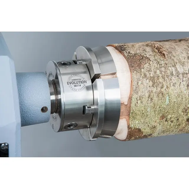 Evolution SK114 Chuck pakke er en dreiechuck for tredreiing levert som komplett pakke. Chucken er satt opp med settskrue for låsing ved reverskjøring. Pakken inneholder standard dovetail grip C-bakker, planskive og senterskure, samt strammenøkkel. Teksten beskriver også at enkelte bilder kan avvike fra faktisk innhold, og brukes kun som illustrasjon. Evolution SK114 er produsert i rustfritt stål ved Axminsters egen produksjon, med små toleranser og fokus på en tynn konstruksjon som holder emnet nær dreiebenken.