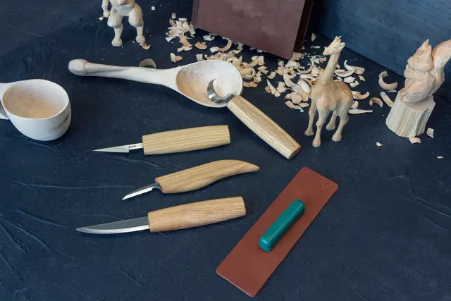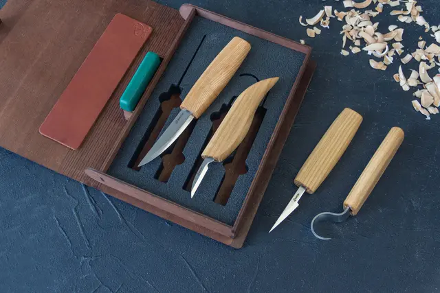Spikkesett fra Beavercraft til skje-, figurskjæring og mye mer i en praktisk tre-eske. 4 grunnleggende kniver du trenger til å komme i gang med spikking. I tillegg kommer settet med polervoks og en lærlapp til polering av knivegg. Alt i en praktisk og lekker treeske for oppbevaring og transport.