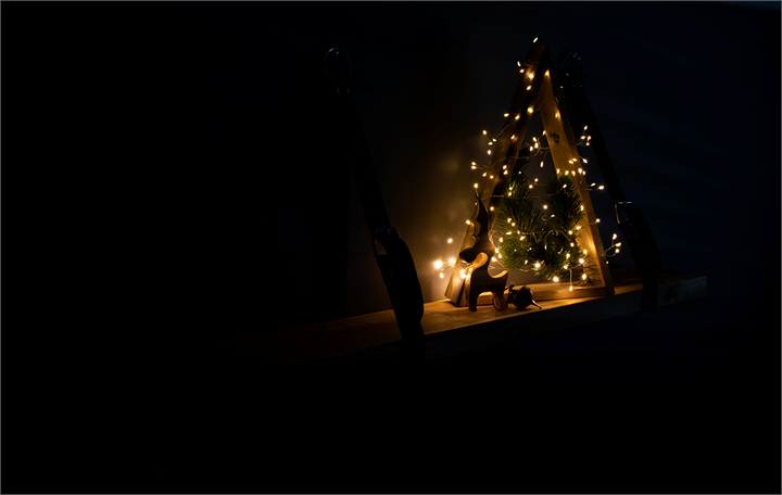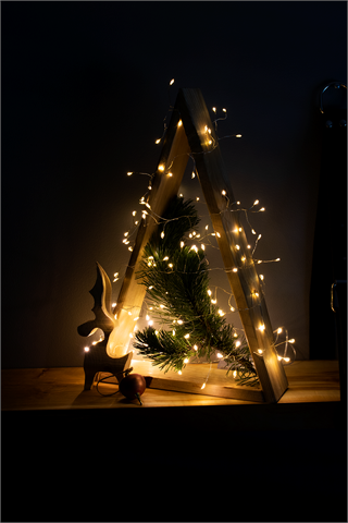 Med en enkel lyslenke og en grankvist dekorerte vi vårt selvlagde juletre. Stemningsfullt, synes vi!
