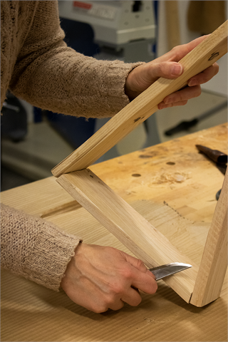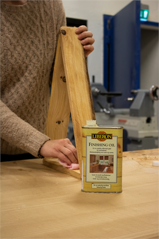 Litt småspikking for avrunding av kanter til slutt før vi så valgte å bare olje treverket med en finishing oil, men f.eks. trebeis i ønsket farge funker også.