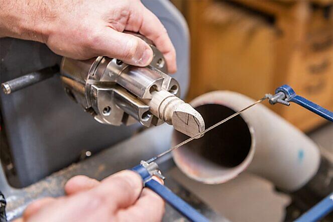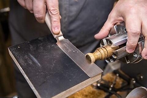 Etter å ha dreid tårnet, sag til 3 kutt med en flat japansag og slipeplattform.