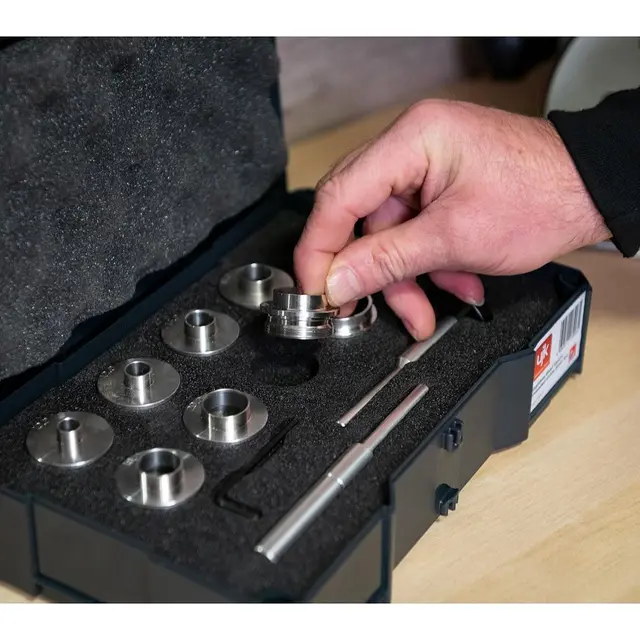 Settet leveres med superpresise sentreringsverktøy for både millimeter- og tommemål. Dette gjør settet dyrere, men i mange applikasjoner er det helt avgjørende at styrehylsen sentreres med høy presisjon i forhold til fresespindelen.